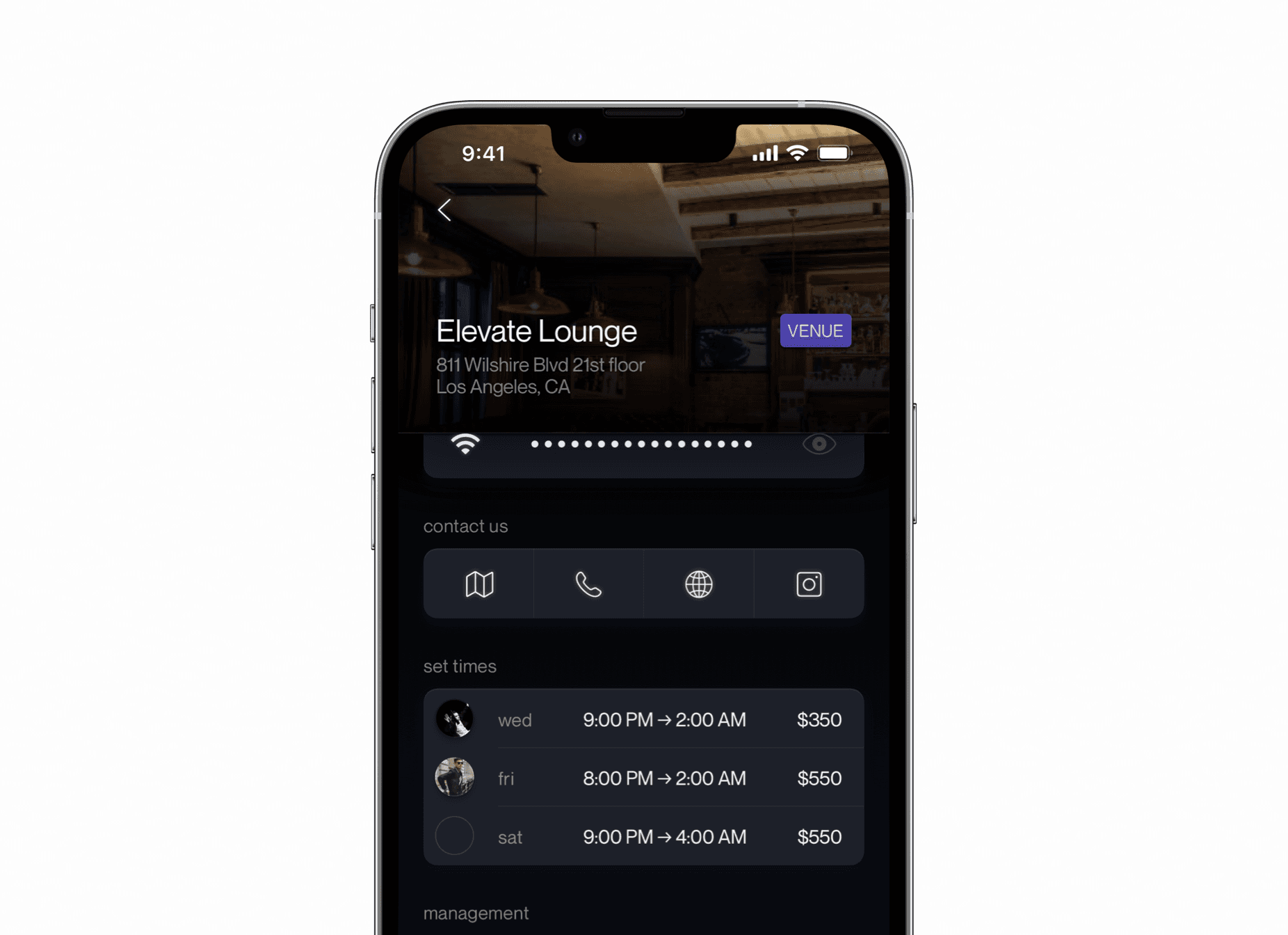 When viewing a venue, unique modules let users view performance details like dress code and equpment details. They can take a look at whose playing soon, and even connect to the Wi-Fi, with just a tap.