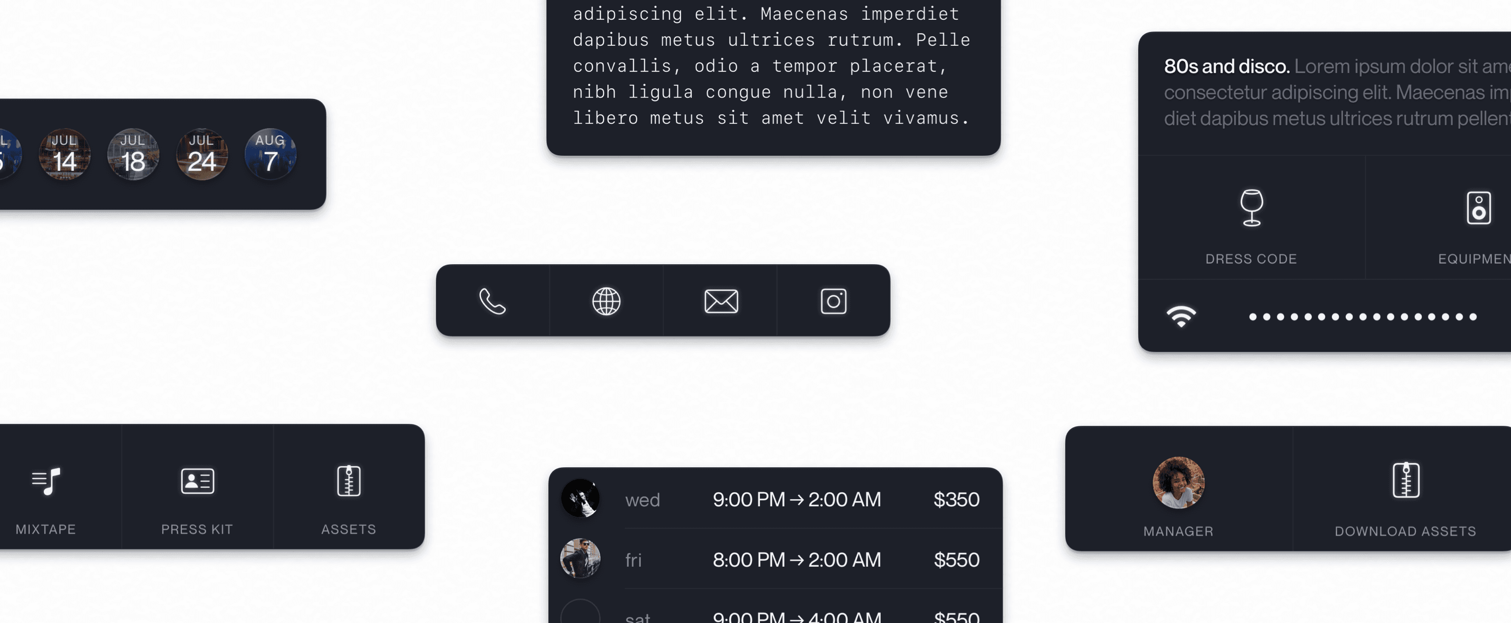 Two kinds of data displayed in gigMarket—user profiles and venue pages—involve disparate pieces of information coming together cohesively. I designed a set of modular components, each with a focused purpose, united with a strong visual language.