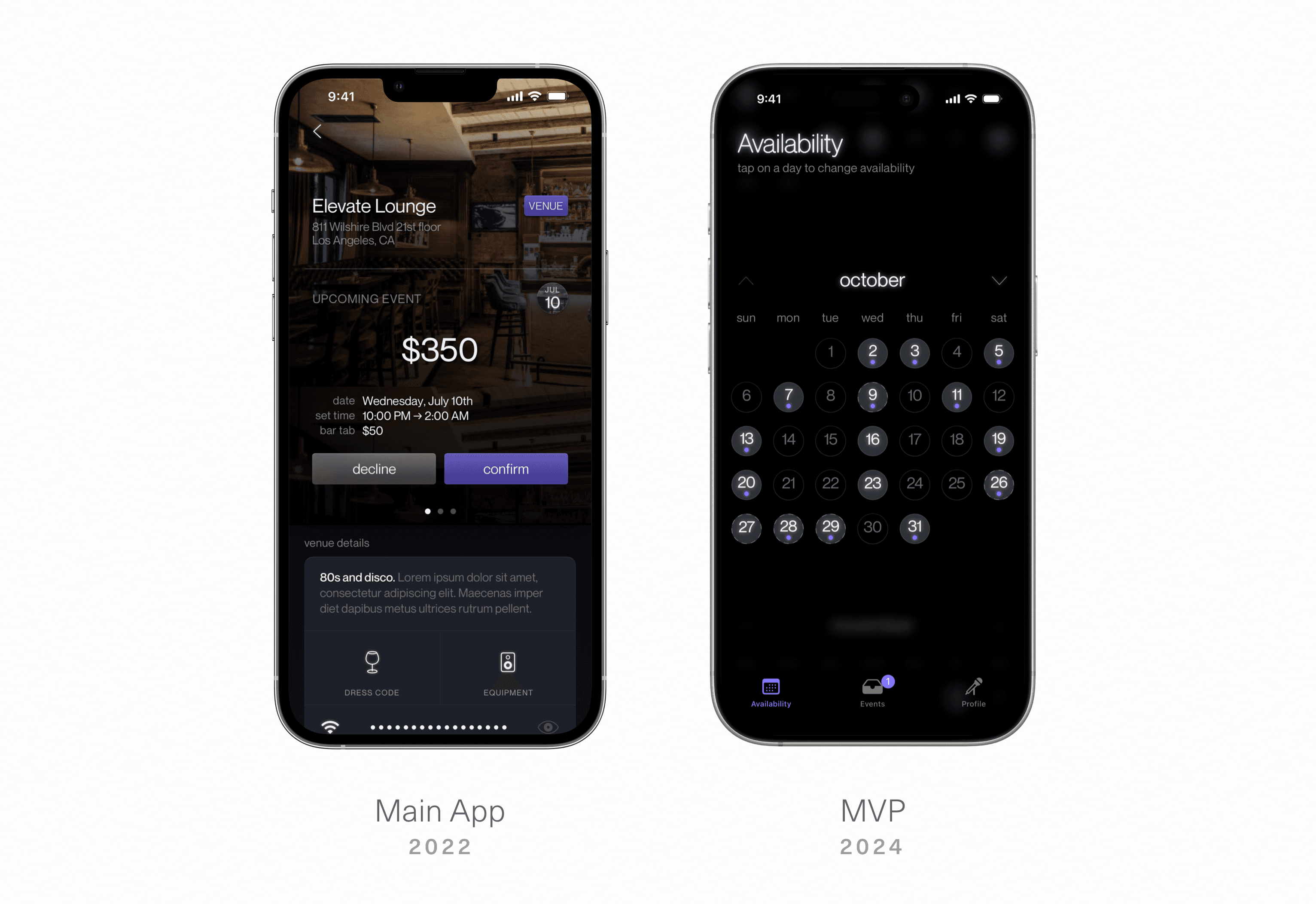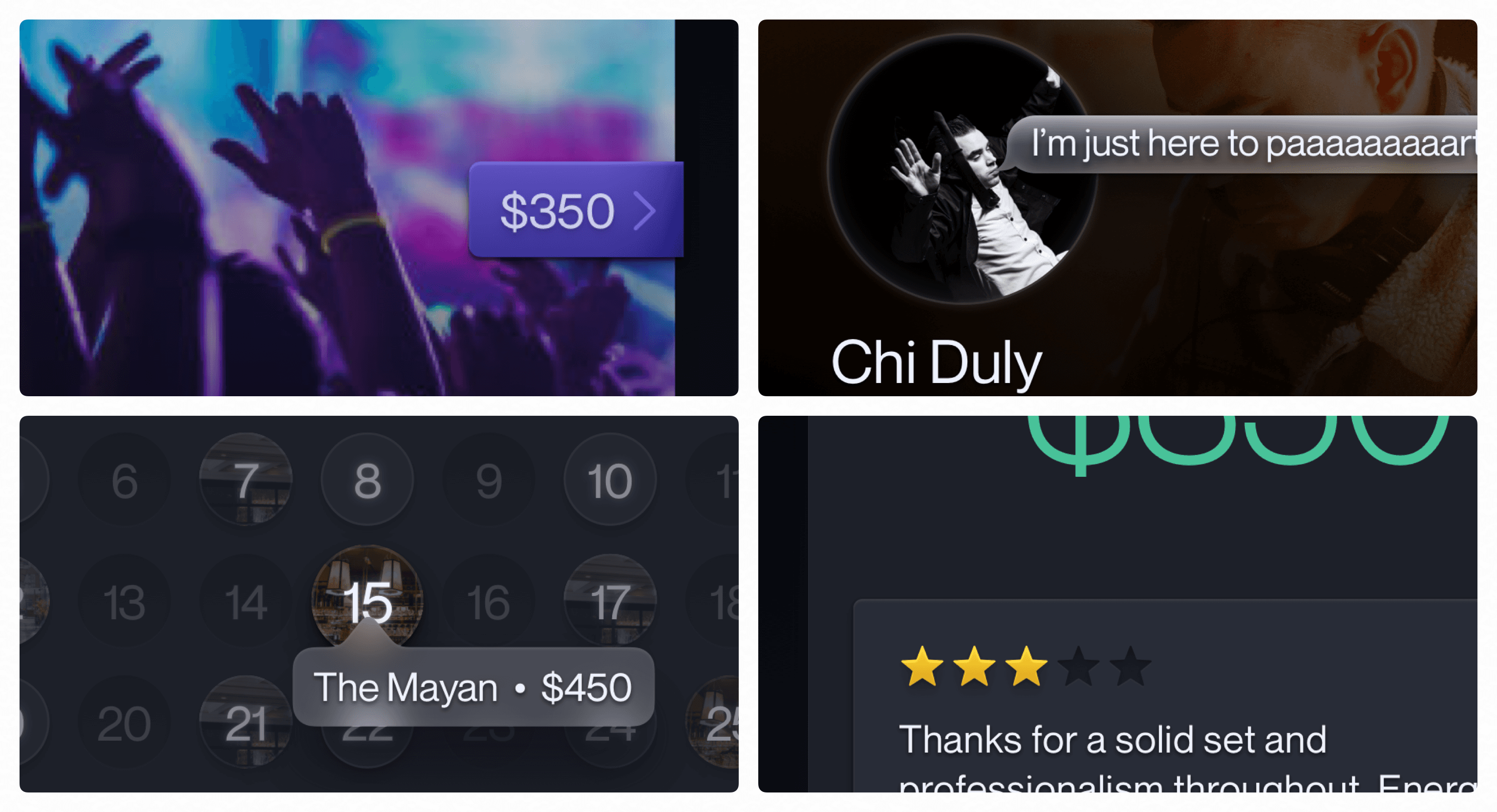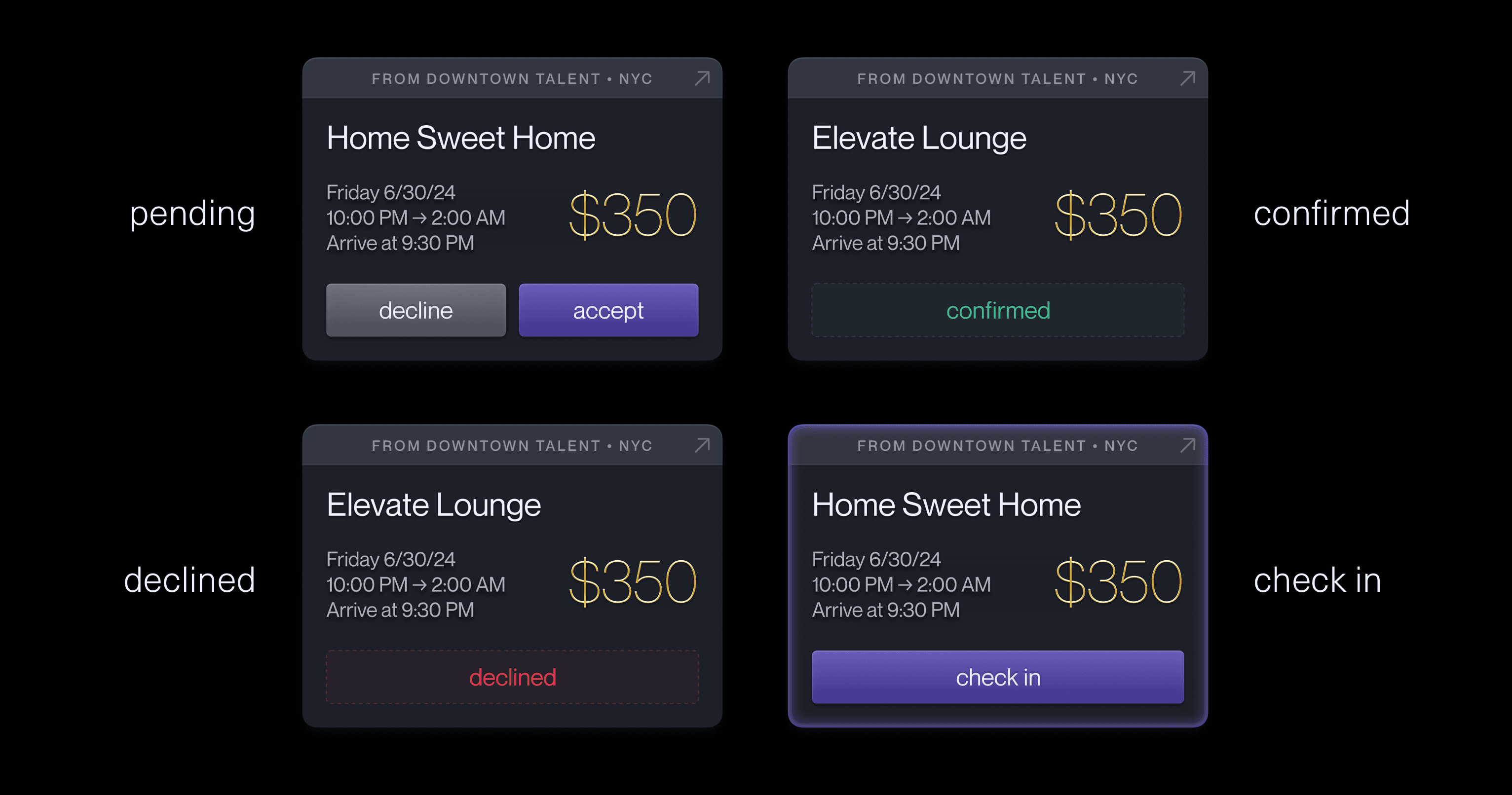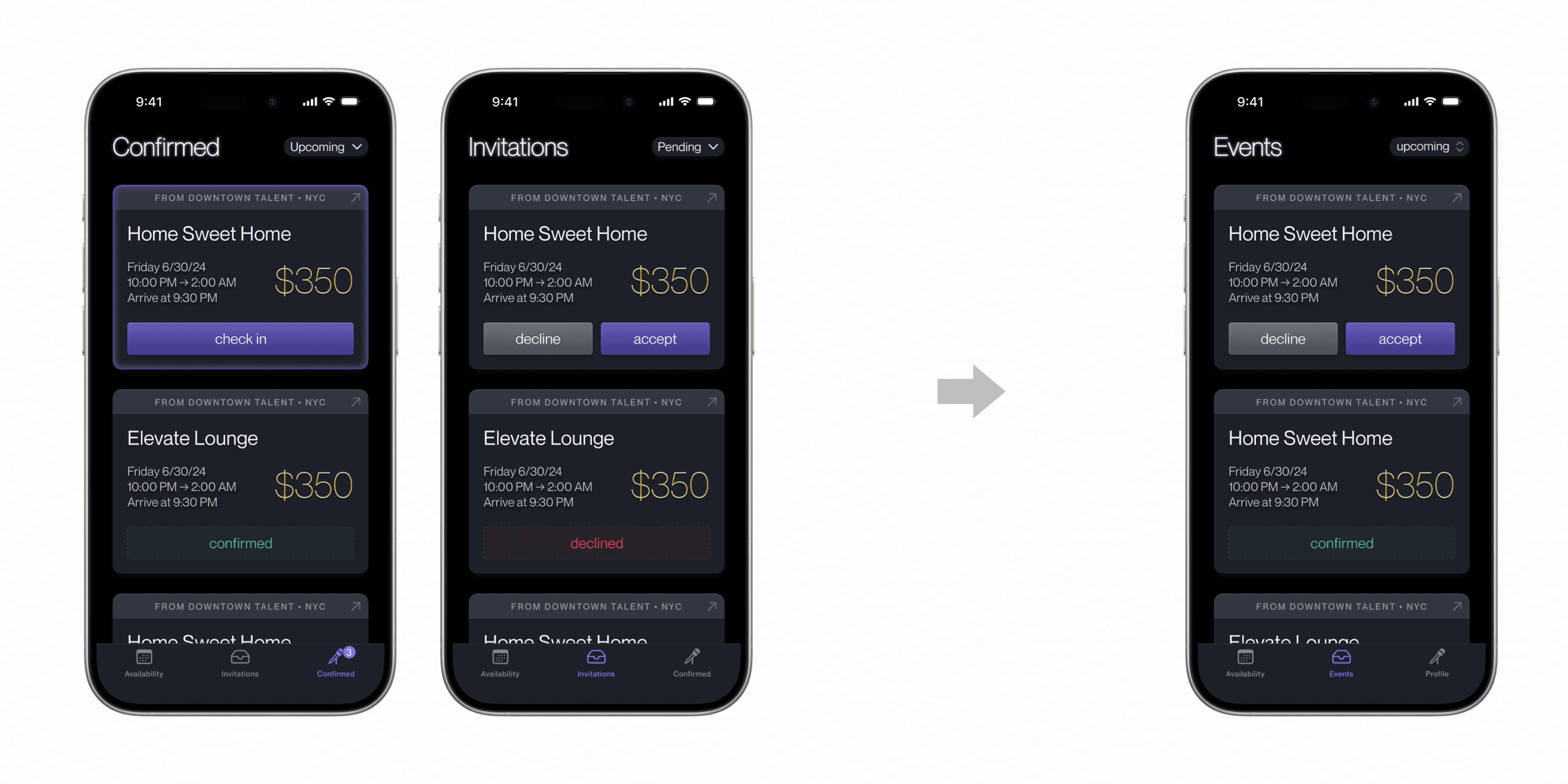 After setting hours, DJs can accept or decline invitations to events. Compact cards transparently display all of the critical information.