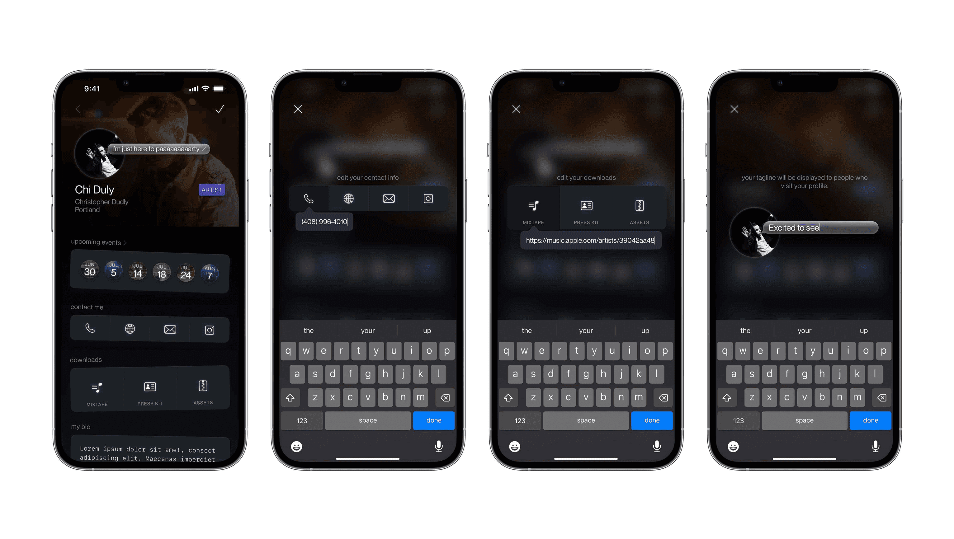 The modules I designed here help an artist to express themselves on their profile. A customizable social graph component links to popular apps, while the links module lets users link their own press kits or mix tapes, right on their profile.
