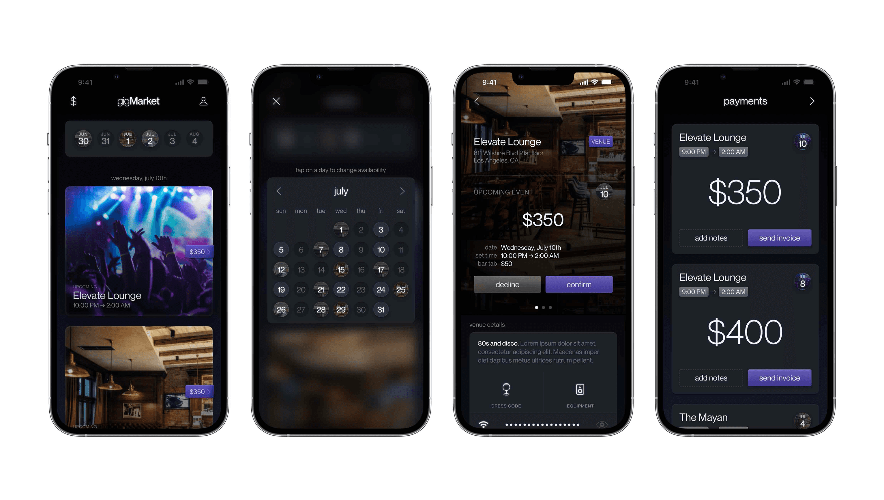 Users can easily confirm gigs, set their availability, and browse venues and agencies, and manage invoices right from the app.