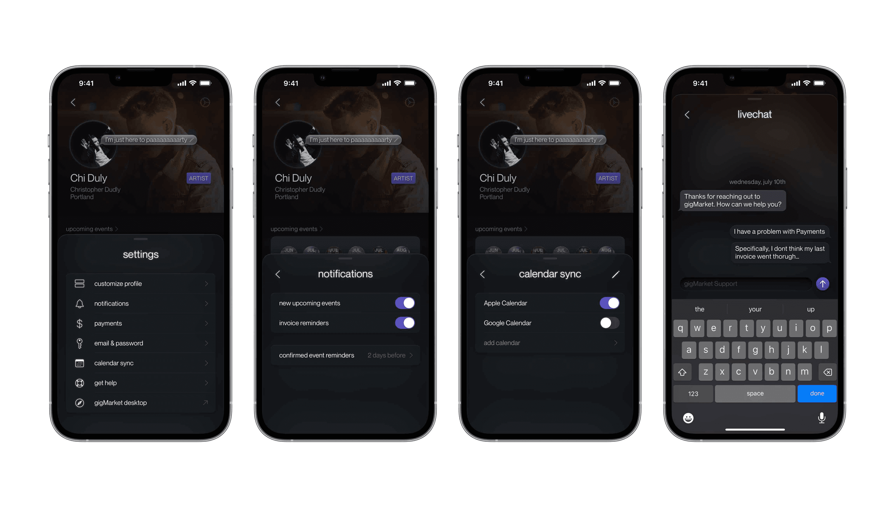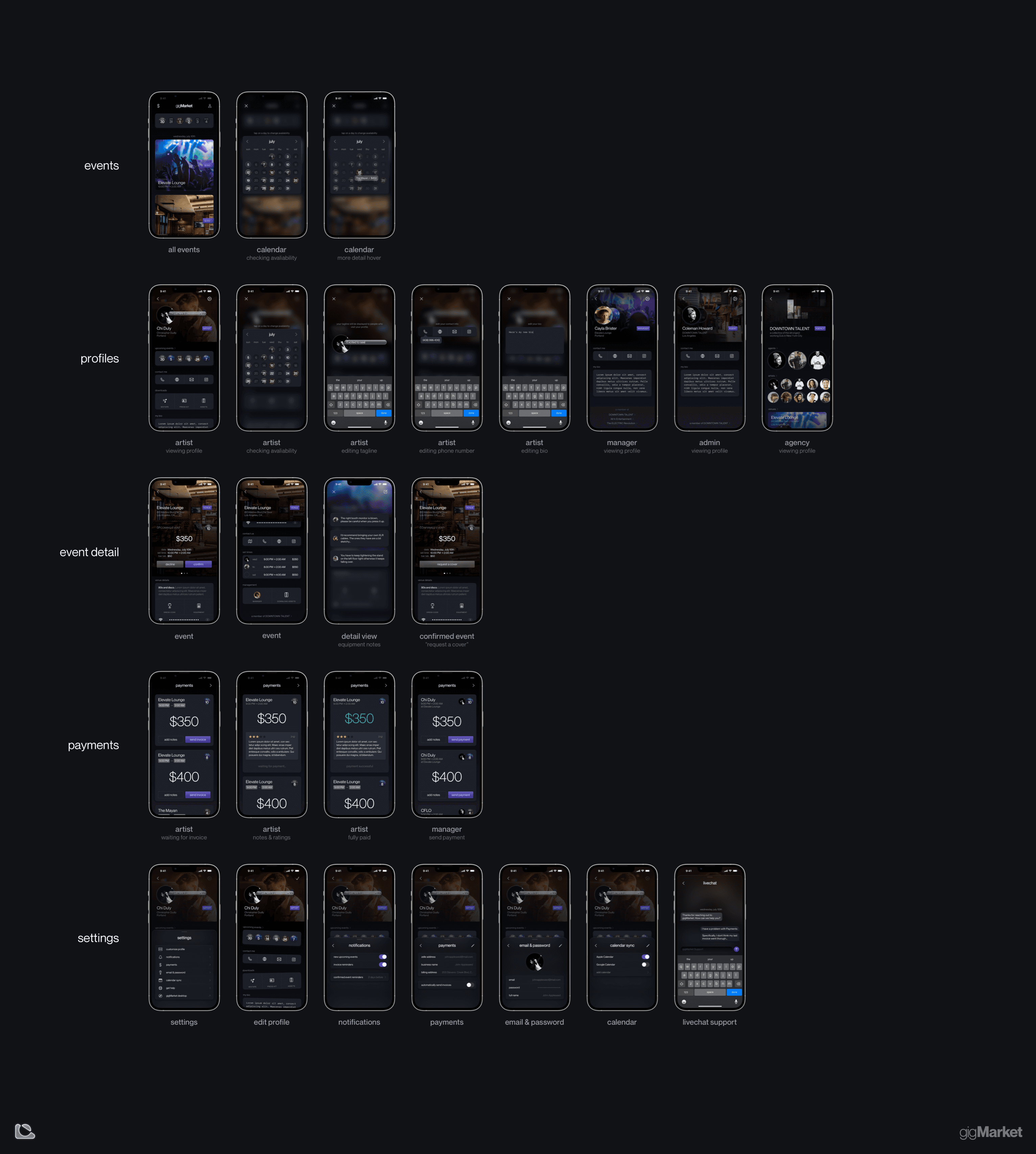I delivered a highly robust design for gigMarket. Every state of the app, and every flow of the interface was considered, from calendars to settings.