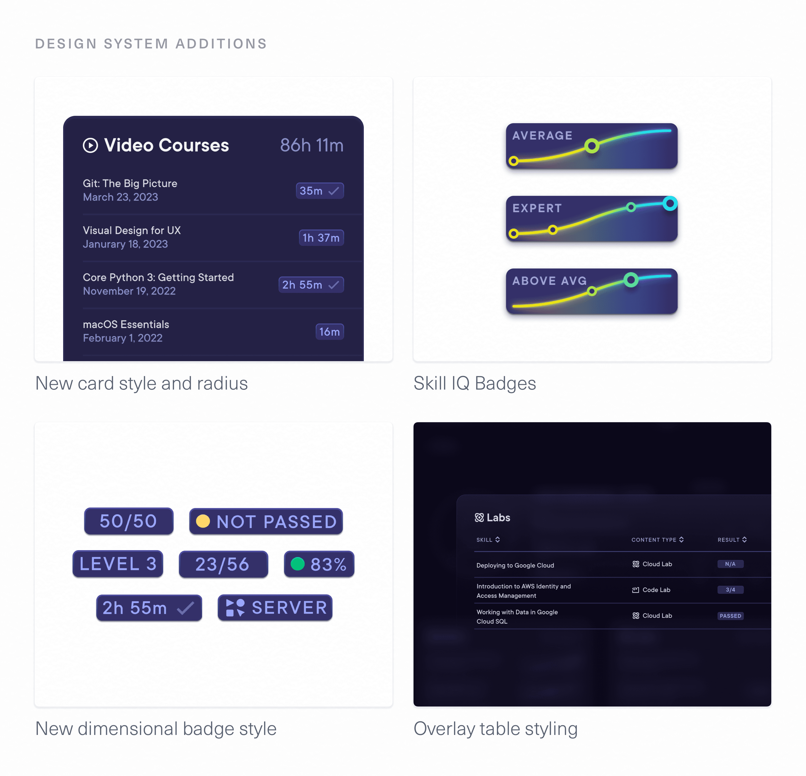 Some of the design details, particularly the card system and new surface treatments, presented new styles for Pluralsight. I worked with the design systems team to add some of these elements as standards going forward.