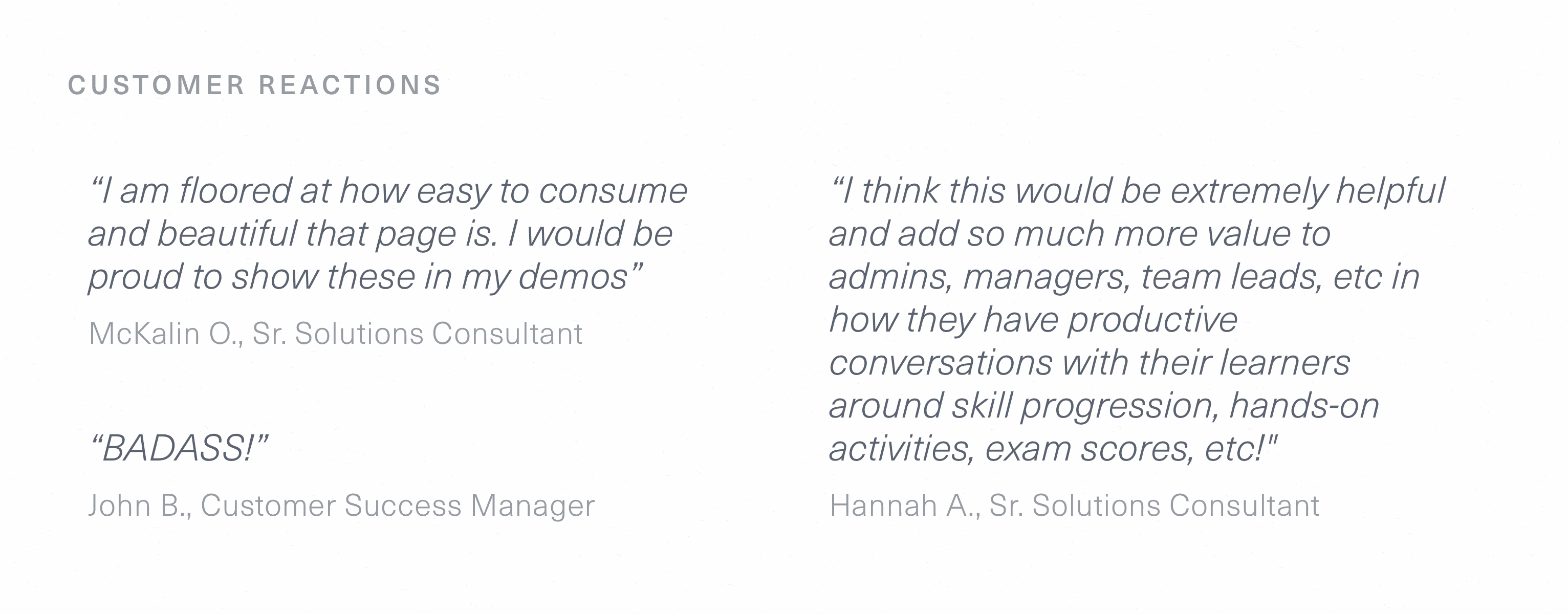 After I created an early interactive prototype, our team began testing it with a group of 25 customers and collected their thoughts. We learned that users highly valued seeing more at a glance. New components I created to illustrate roles, skill levels, and activity completions give users a “gestalt” sense of progress that just didn't exist with the prior design.