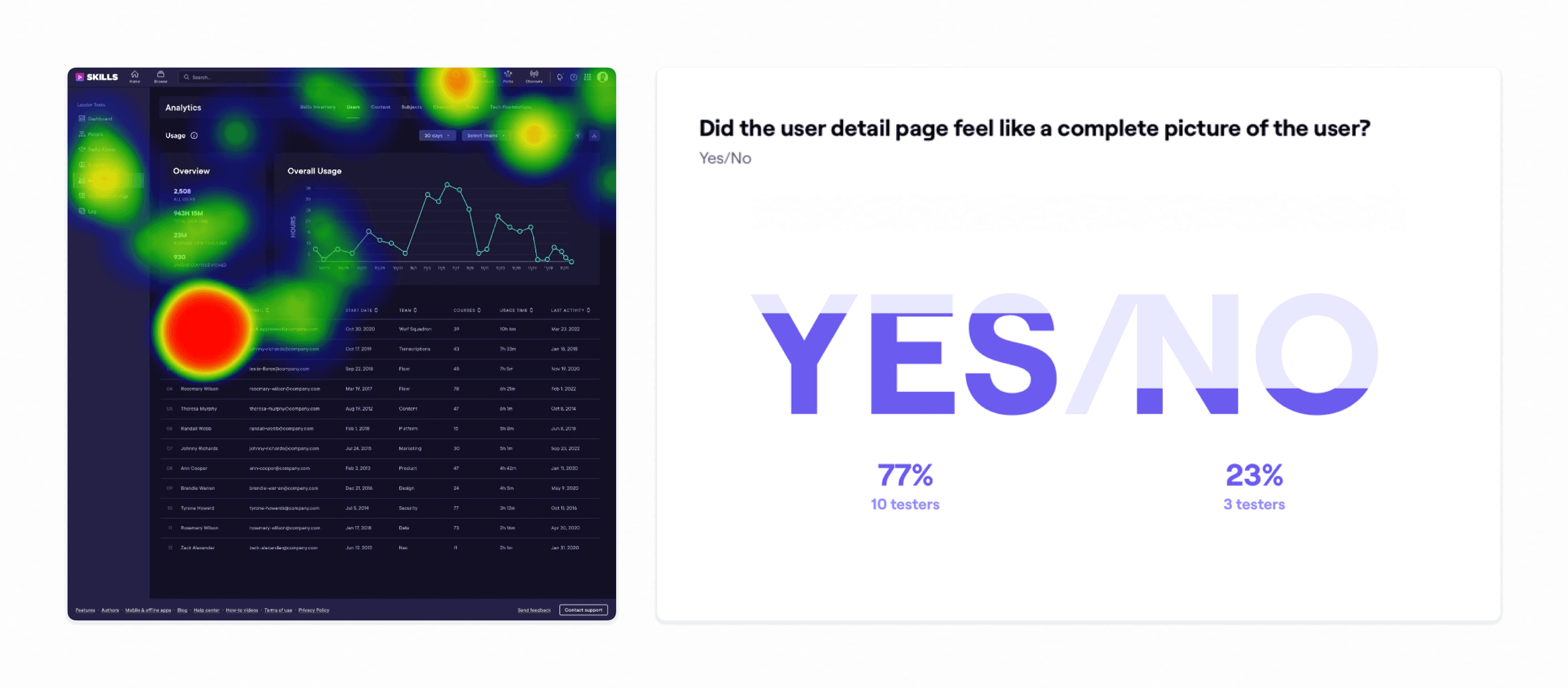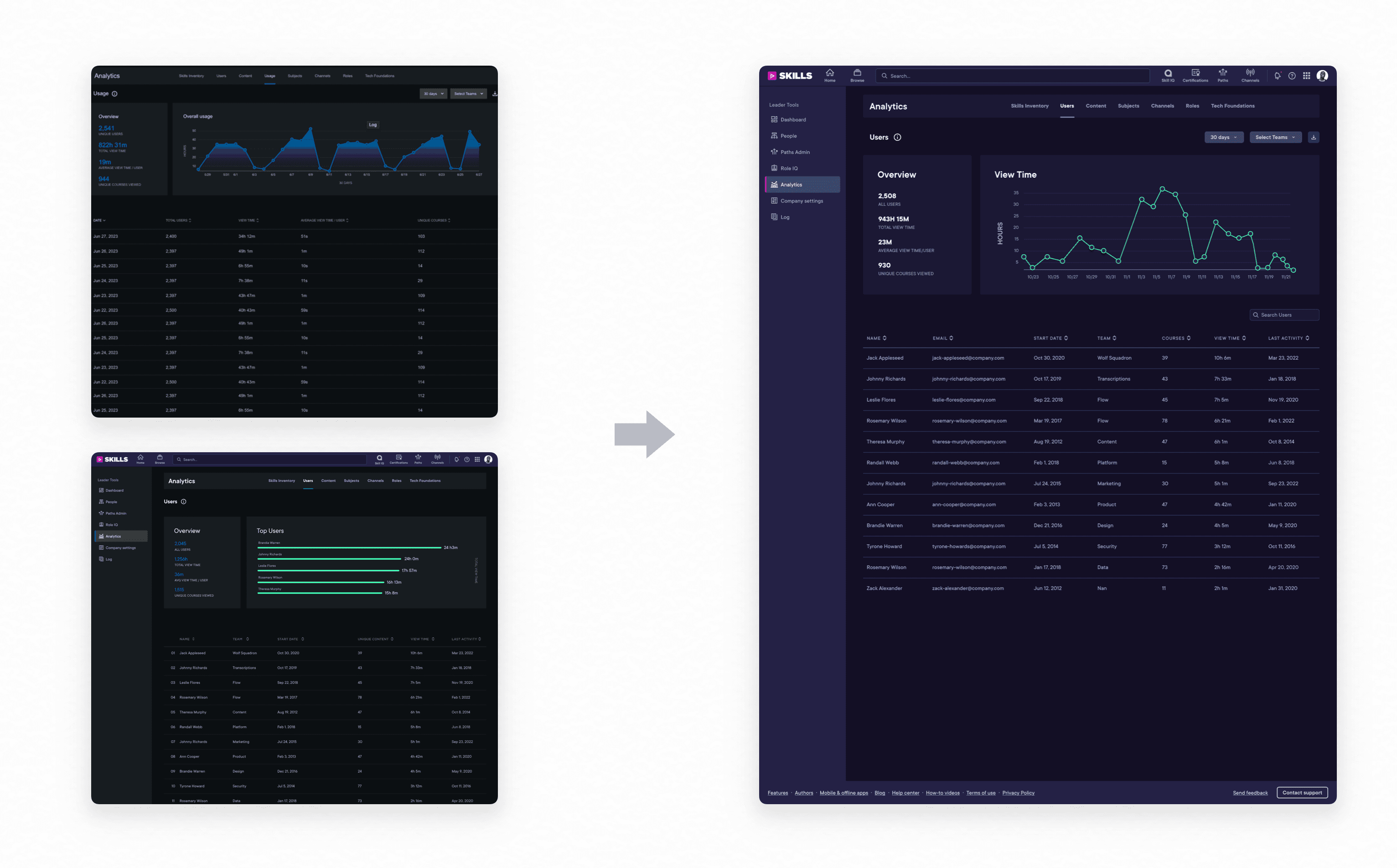 The main Users Report, which displays analytics for all learners in an organization, was outdated and didn’t have a clearly defined role. It had yet to be updated to the latest “Pando” design system style, and contained information that was largely redundant with another tab, Usage. I pushed to unify the two, and designed an improved page to facilitate the merger:
