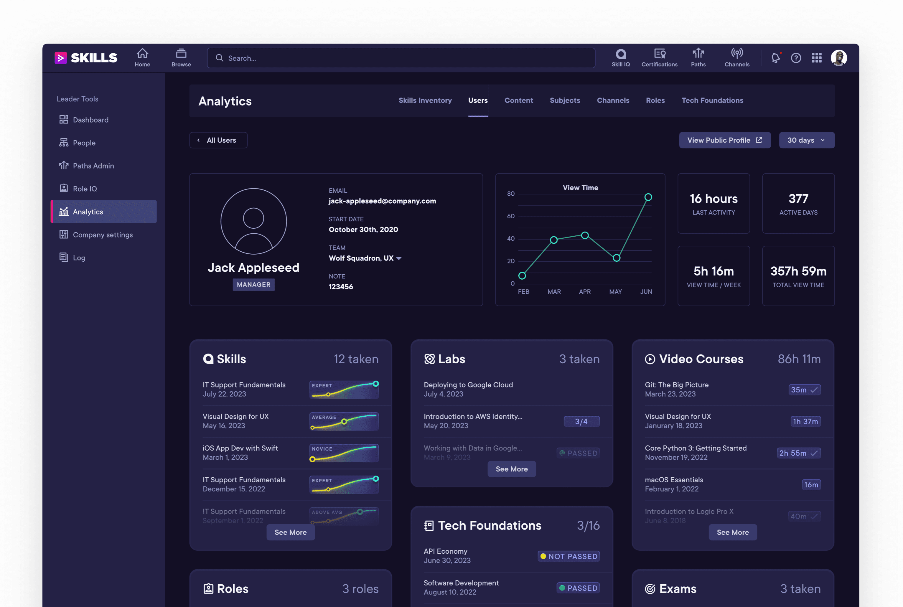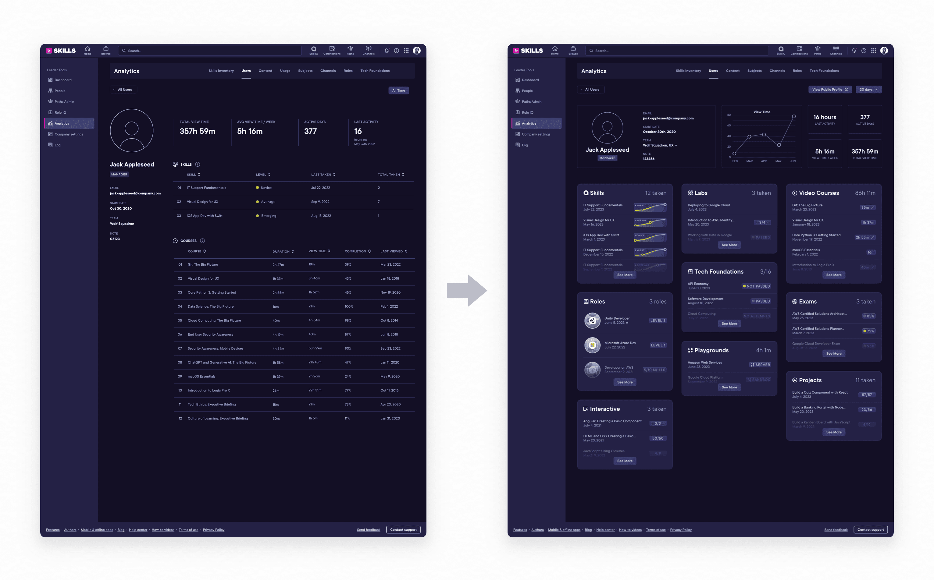 The reimagined User Detail page empowers customers to instantly understand how a learner is growing with Pluralsight. With a quick glance, it’s easy to see what skills a learner is developing, where they are strongest, and what parts of Pluralsight they are taking advantage of to get there. This information is essential for organizations to see the benefit of the product—if growth isn't made clear, why even pay for Pluralsight?